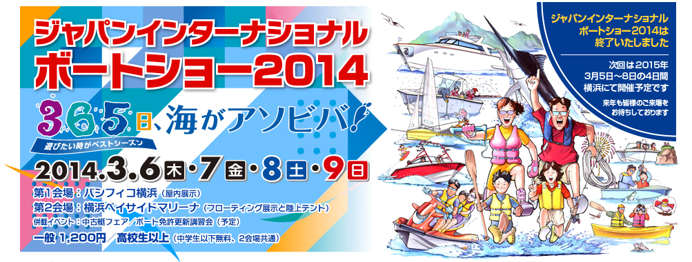 「ジャパンインターナショナルボートショー2014」は2014年3月6日(木)から9日まで開催されます。公式サイトでは出展情報、イベント情報など順次掲載していきますのでお楽しみに。