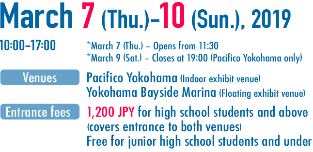 The Japan International Boat Show, the largest exposition in the Japanese marine industry, will next be held over the four days of March 7 to 10, 2019. Gathering over 200 exhibiting companies and organizations, the event features not only the latest motorboats, sailboats and personal watercraft (PWC) models on display, but also offers up-to-date marine leisure information for the 2019 season, covering facilities like marinas, boat operator licensing, navigational instruments and devices, marine wear and more. We look forward to seeing you at the Pacifico Yokohama and Yokohama Bayside Marina!